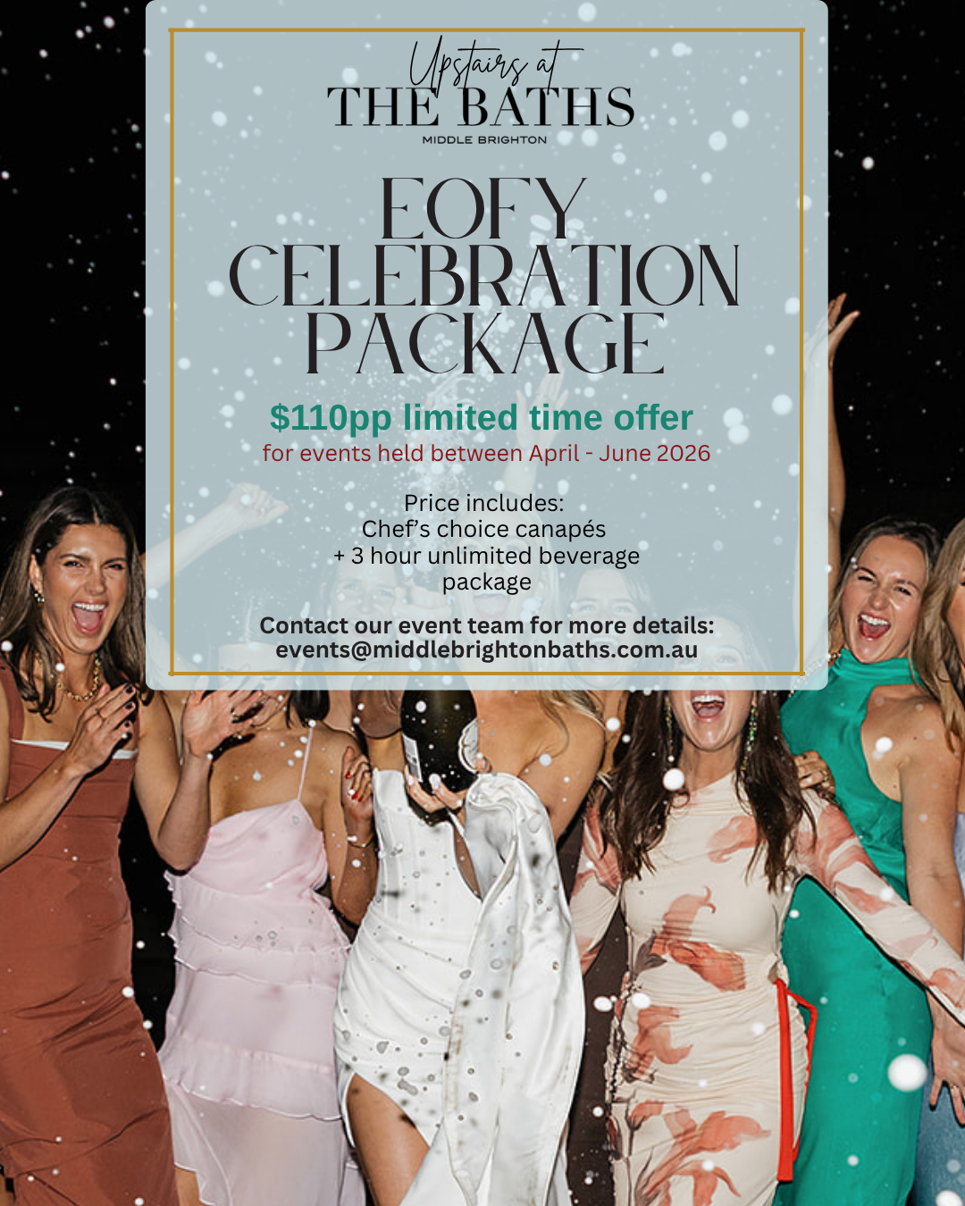 Book your EOFY celebration with our all-inclusive 3-hour unlimited beverage package and chef’s choice canapés for just $110pp.